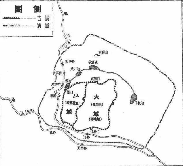 这座新修筑的成都城究竟有多大?唐代西川节度使高骈《请筑罗城表》说大城是“周匝不过八里”,这说明大城南北各近二里,少城南北约一里余。按唐制大里计算,一里为531米,八里约合今4248米,则大城一边仅1062米。简单说来,秦大城比清皇城略大一点,少城比清满城稍小一点。
