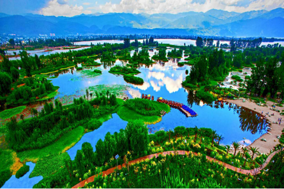“西波鹤影”湿地公园,恢复建设湿地1750亩,北接月色风情小镇,南连邛海湾酒店,全长3.5公里,把整个邛海西岸连接成一条充满活力的绿色景观链和生态动感走廊。