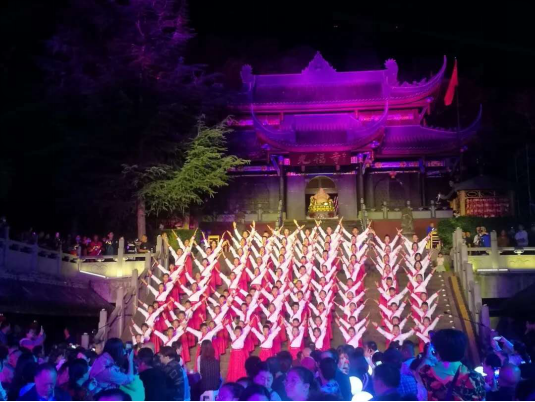 10月1日中秋节19:00左右,月亮女神从泸山对面的山峰后面缓缓升起,拂开灰蓝的云层,难得地露面了,伴随着歌舞声、欢笑声,十分应景地时隐时现。特别是当《十五的月亮》歌声响起时,月亮女神把厚重的云层抛在后面,把清辉洒满了泸山,千年古刹在变换的灯光中,显得格外庄严、辉煌、美丽。在光福寺做了20多年义工的周嬢说:从来没有看到过光福寺这么漂亮、这么闹热,真的是很激动啊。