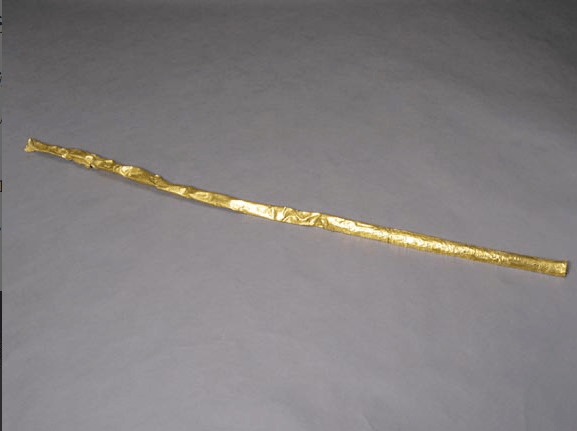 三星堆这柄金杖,从形制上看,与西亚、埃及较晚时期的权杖相似,属于细长类型。近东权杖的一个显著特点,是在杖首或杖身头部有图案,描绘胜利者的功勋,或叙述某件关乎国家命运的大事。无独有偶,三星堆金杖同样在杖身上端刻有平调图案,内容也同样与国家权力有关。考虑到这些因素,同时也由于在古蜀王国本土和商代中国没有使用权杖的文化传统,因此,三星堆金杖看来是通过某种途径,吸收了近东权杖的文化因素而制成的。
