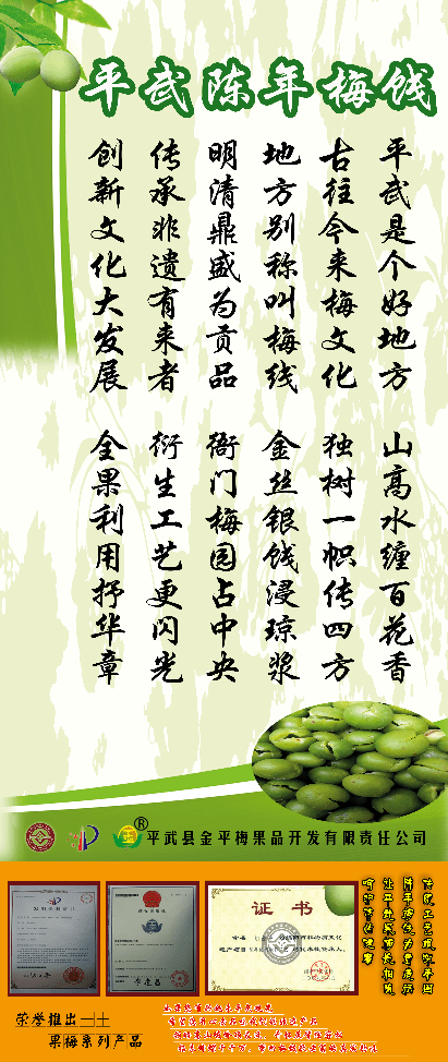 平武自古盛产果梅,梅饯是平武的代名词。如今县内有果梅园3.5万亩,实生野梅全县各乡镇均有分布。近六百年的梅树至今照常挂果株产达千斤以上。陈年梅饯制作是平武家喻户晓的亮点,在当地有这样一首歌谣:“陈年梅饯人人夸,香脆可口又化渣,若要提高健康值,最好每天吃点它”。据传说,陈年梅饯的原创制作人,就是明代初期古龙洲官至六品的土官王玺。