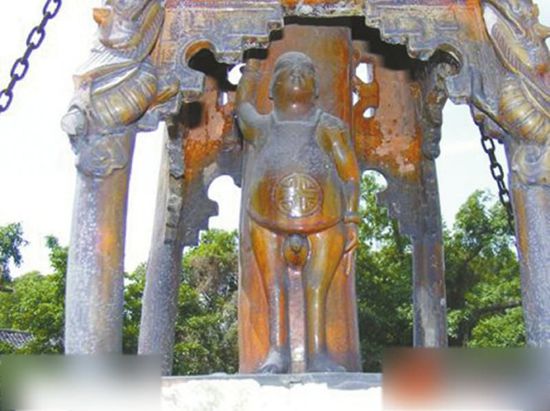 我们看到的这个裸体塑像是呈站立姿态,下体裸露,身穿肚兜,从肚兜的特征推断他是一名男童,但也有成年人穿肚兜的少数情况。该塑像生殖器部分制作得比较肥大,与儿童幼小未发育的特征不十分吻合。