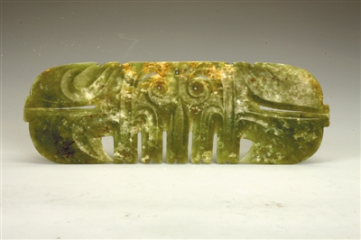 这次还展出了猪龙、勾云形器等多件红山文化的玉器。勾云形器是红山文化晚期的代表玉器,牛河梁遗址第二地点一号冢27号墓出土。玉为深绿色,有黄色瑕斑及开片。器体呈扁平长条形,有正、背面之分,两面都有雕纹,正面雕纹较深。可以看出,这件玉器不是完全写实性的,而是通过想象和夸张,将几类动物的特征集于一身,采用拟物与抽象相结合的手法,以平面减地打磨的工艺,表现出红山文化先民高超的玉器制作水平。