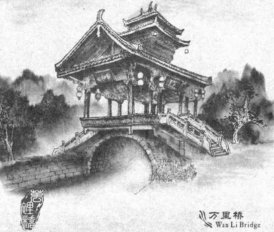 万里桥,位于成都市老南门,横跨锦江,势如饮虹,连城南通衢,又名老南门大桥。秦昭王年间(公元前256—前251年),蜀郡守李冰于二江(郫江、检江)之上应天上七星建七桥,合称“七星桥”。七桥之首名“长星桥”,长十余丈,高三丈,宽一丈五尺,为七孔石板桥。因桥下有一眼笃泉,故亦名“笃泉桥”。三国时期,蜀国费祎出使东吴,蜀相诸葛亮为其饯行于此,费祎曰:“万里之行,始于此矣!”,后“长星桥”改名为“万里桥”。