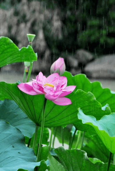 颔联结撰极为精心,所写光景别饶情趣:翠竹轻摇,带着水光的枝枝叶叶,明净悦目;细雨出落得荷花格外娇艳,而微风吹送,清香可闻。“含”“裛”两个动词运用极细腻生动,“含”有小心爱护意味,风之微不言而喻;“裛”通“浥”,尽显轻柔,雨之细不言而喻。写微风细雨全从境界见出。