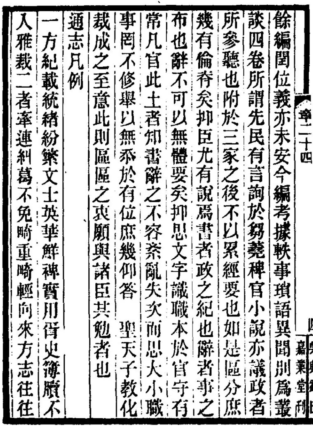 “义”即主旨,它包含了主体强烈的主观意志,当然这种主观意志处于意识形态及其相关思想观念的影响之下;“例”即体例,是通过整体结构性的规定来致力于实现主体意志在客体上的完整反映。从古至今,“义例”即主旨与体例是方志的重中之重。甘鹏云《方志商》称,义例不定,“如裘无领,如网无纲”。