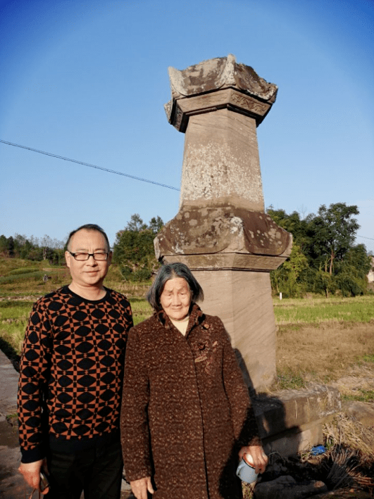 图为作者与当地老人袁朝群在桂花石字库前留影