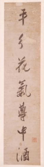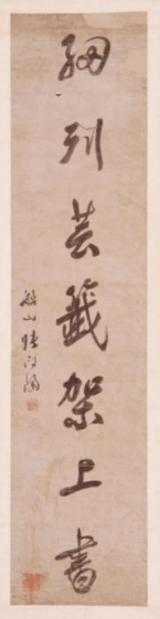 该联字体险劲放野,潇洒飘逸,雄健浑厚,笔势飞动,结构富于变化,颇有米芾遗风。此联应为张问陶自撰,在他的《论诗十二绝》中主张“好诗不过近人情”,他本身亦是个有情人,他抒写“私情”的性灵诗中,充满了伉丽情、手足情、朋友情等人伦情怀,在该联中也可见他的真性情。上联“平分花气尊中酒”,就那么一尊酒,也要与亲人抑或友人共饮;下联“细列芸芊②架上书”,将自己的爱好与行为彰显示人,真实表现读书人于书的珍惜。