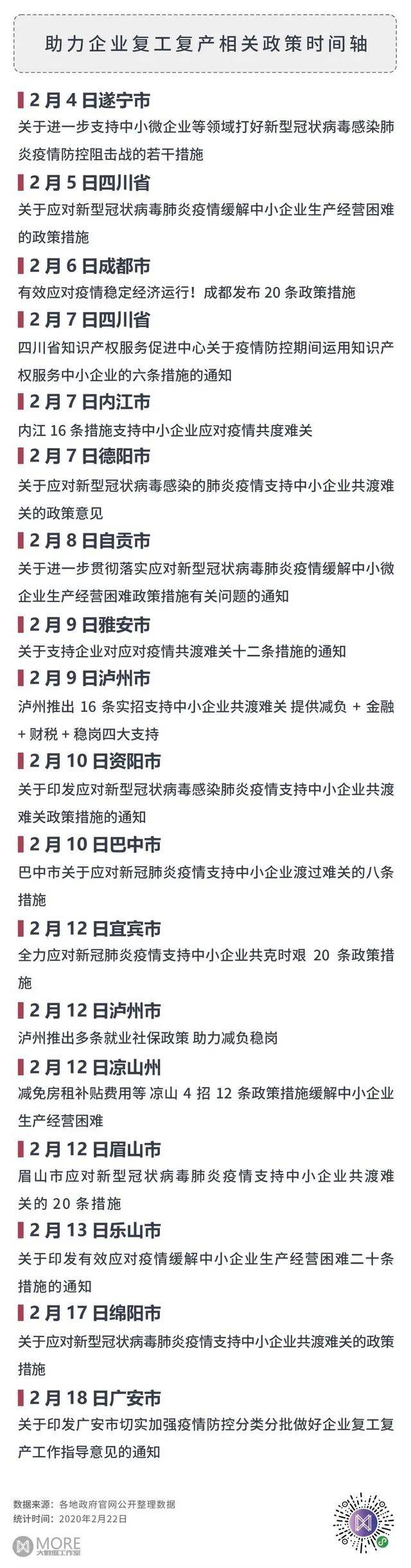 2月5日,四川出台缓解中小企业生产经营困难的“13条措施”,3月13日又出台应对疫情稳定和促进服务业发展的指导意见;21个市州相继出台贯彻实施方案或配套政策,有序推动政策落地。