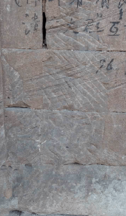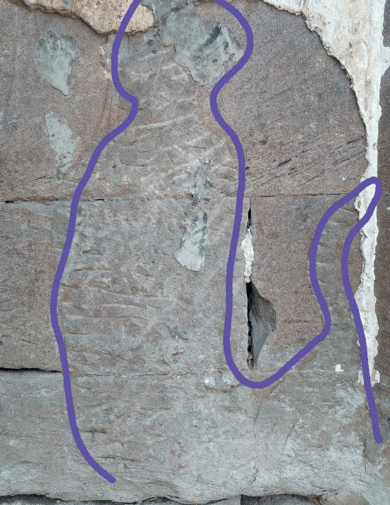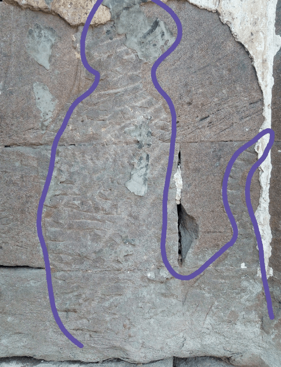 一开始,我发现底层门洞右侧有一条像“蛇”一样的尾巴痕迹残留在塔身石头上,这条尾巴很形象(如图2)。