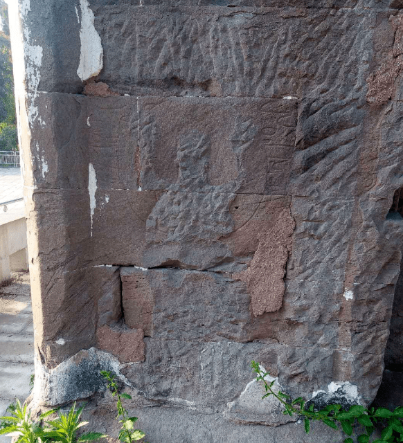 在我看来,揭开古塔之谜的关键信息,还藏在这位“头顶光环”的神像门洞另一侧的残迹里(如图7、图8)。这是一幅难度非常大的猜想图,不像前面的“青狮白象”具有标志性特征。这幅图真的很难猜,而当你蓦然破译出这幅残迹的原本面目后,你会发现这座塔更多的秘密。