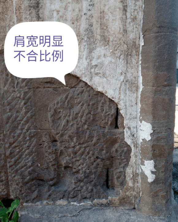 我在第二次专程探秘的时候,发现这幅残迹里其实也是有光圈的,只是非常短,极不明显。这段短小的光圈再次证明,这个痕迹里的也是一位佛或菩萨。但是这位佛菩萨的头与肩宽的尺寸非常失调,严重不符合人像正面站或坐的肩宽比列,这又该如何猜测呢?