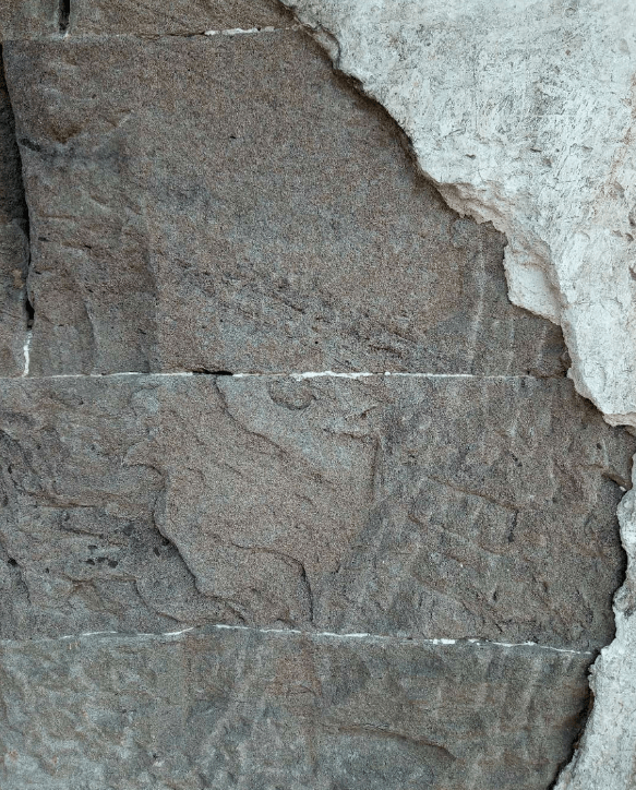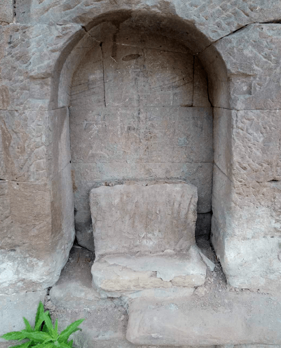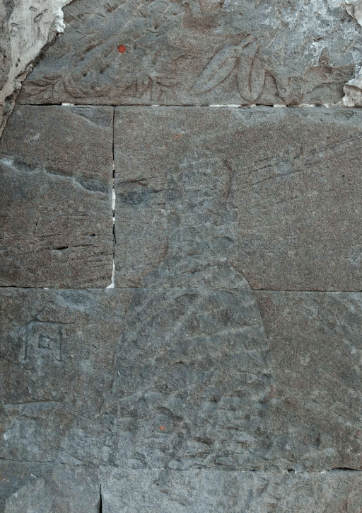 在佛塔的另外一侧,也能清晰地看到一尊佛像,下部底盘感觉比较宽大,猜测为莲花座的可能极大,我们仿佛能看到一尊佛坐在莲花中。佛像痕迹头顶上方有树叶雕刻,清晰而精美,可能多数人还是会误认为是柳树叶,但它不像柳树叶那么尖细,应该是菩提树叶,所以这幅残迹上曾经的石刻要表达的是:释迦牟尼佛菩提树下悟道的经典佛教故事(如图16)。