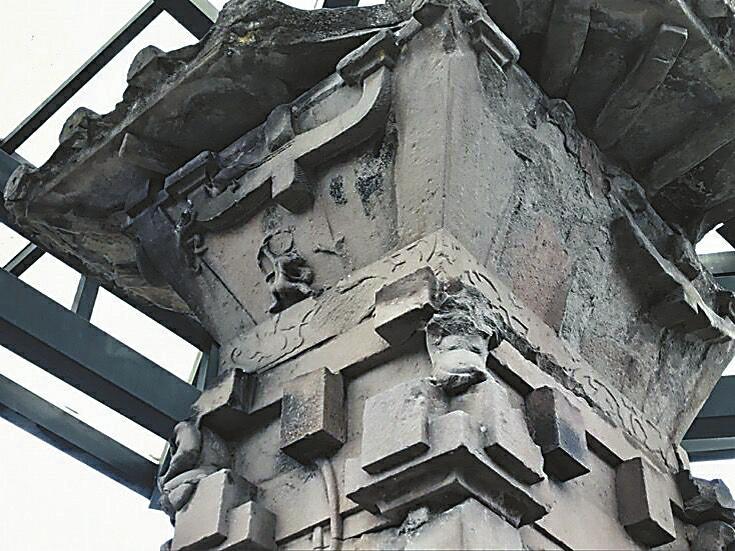 不过,渠县汉阙也并非没有被人为破坏过。当记者走近沈府君阙时,只见左右两阙的四个角神均已面部模糊,残留的身体显示出负重的形态,而阙上部分有整齐残损的地方。“从受损处的情况看,显然不是风吹日晒等自然原因造成的,更像是被人为敲掉了面容。”钟华说。同时,多处渠县汉阙的阙基显示,在它们建成时其实是子母阙的形制,较高大的母阙旁边还伴有一座稍小的子阙,这些子阙如今也统统消失。
