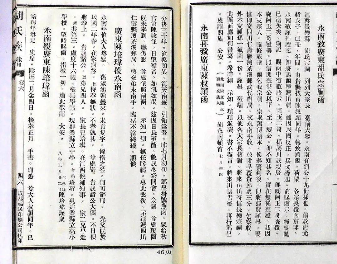 1925年,在族谱编修告竣之际,胡永南将48封书信录于族谱中,取名《蜀粤闽征信录》,以告知后代,希望后人追念先辈修谱之艰难,备加珍惜族谱,光大于未来。