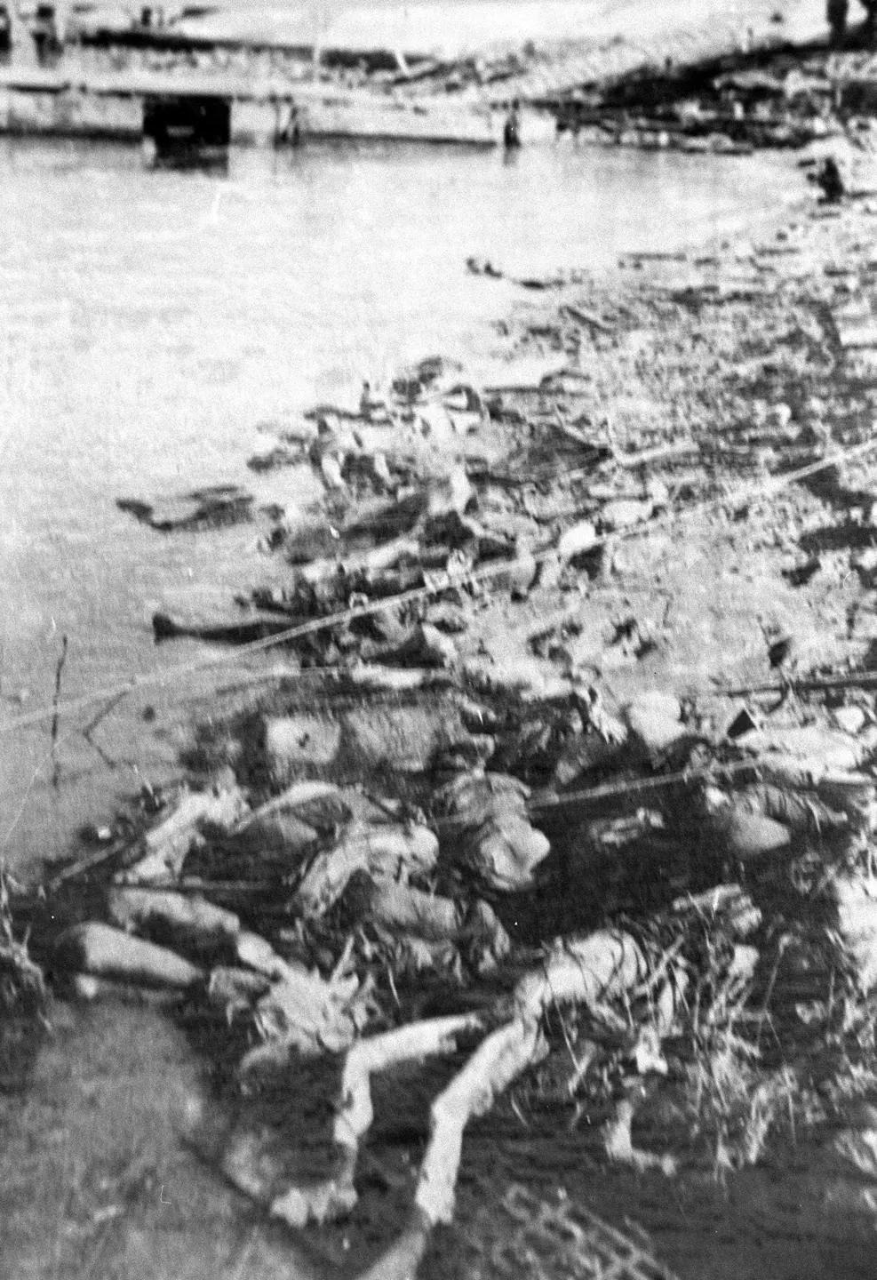 1937年底,进入南京的日军将中国军民送到下关江边以机枪扫射,尸体堆满了江边,惨不忍赌,行凶后的日军站在尸体旁,若无其事(图片来源:光明日报)