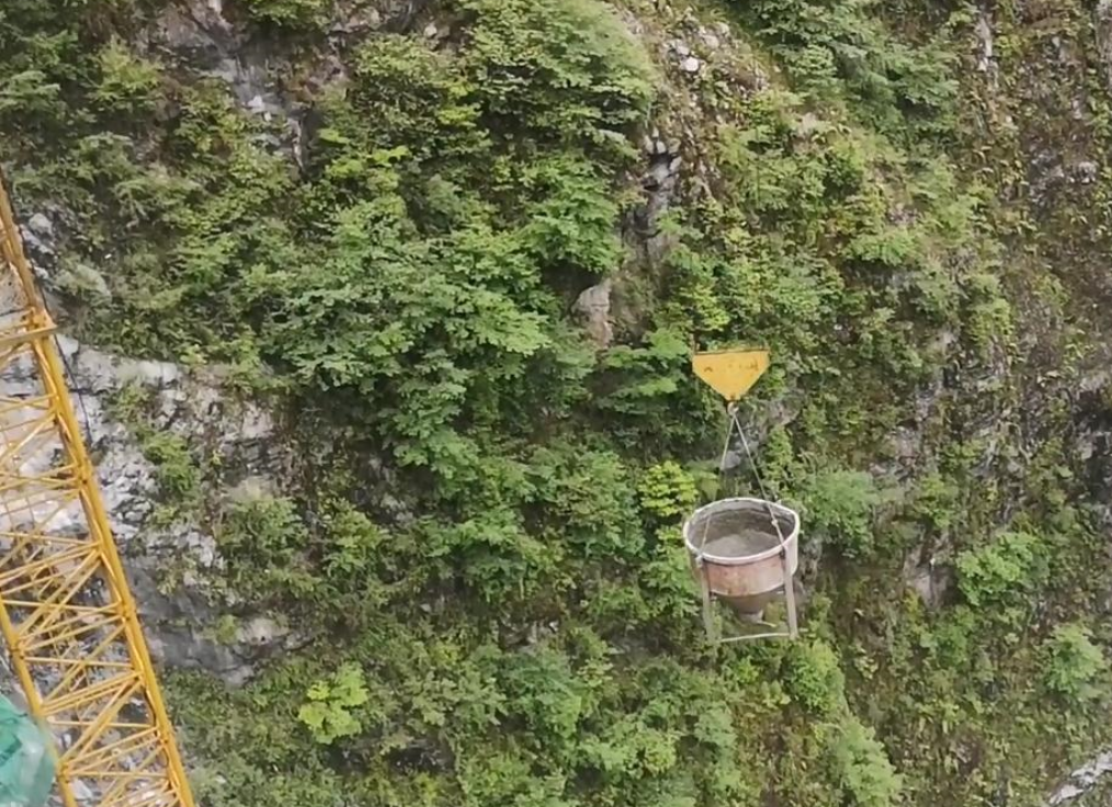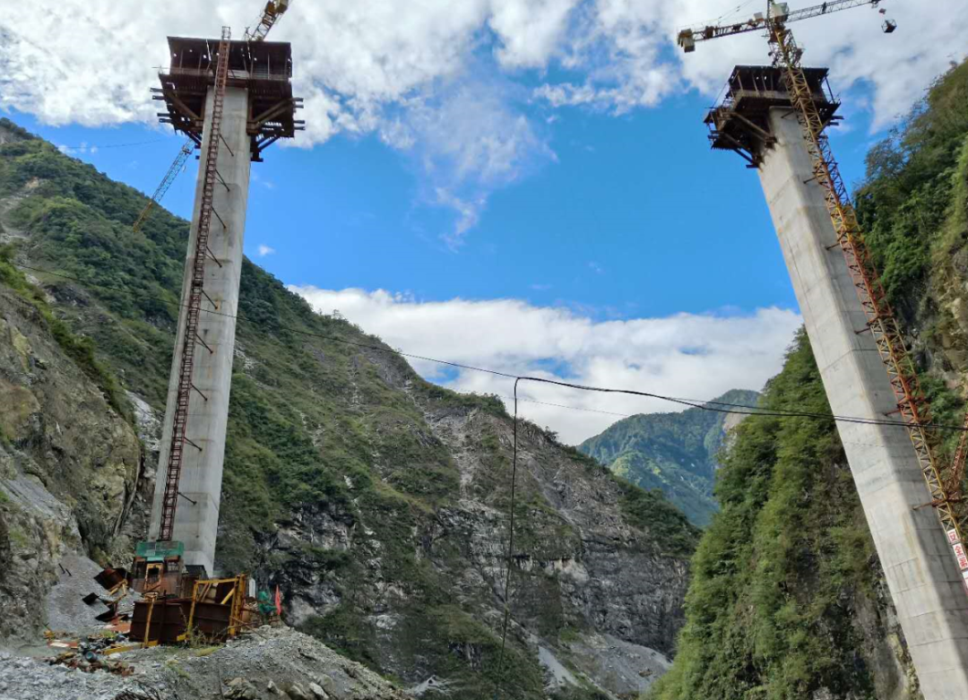 小木岭大桥建设工地地势险要,两侧山体飞石频繁,高位山体崩塌时有发生。土石方爆破、开挖削坡等施工作业,更增加了次生灾害发生概率。在桩基施工期间,施工人员在河畔修建临时驻地,一天晚上突遇飞石,将施工人员砸伤。为保证安全,项目部只好在小木岭大桥周边的山体上挖洞用于工人驻地。由于施工场地所限,大型机械设备根本派不上用场,一度靠工人肩扛背驮。以墩柱建设为例,大桥2号墩桩基位于半山腰上,前期施工机械无法到达,只好全部采用人工挖孔,人工运输和安装钢筋,每天的施工进度非常有限。墩柱施工采用液压爬模,工人必须一模一模浇筑,平均3到4天一模,78米高的墩柱,要循环浇筑20多次,十分考验工人水平。
