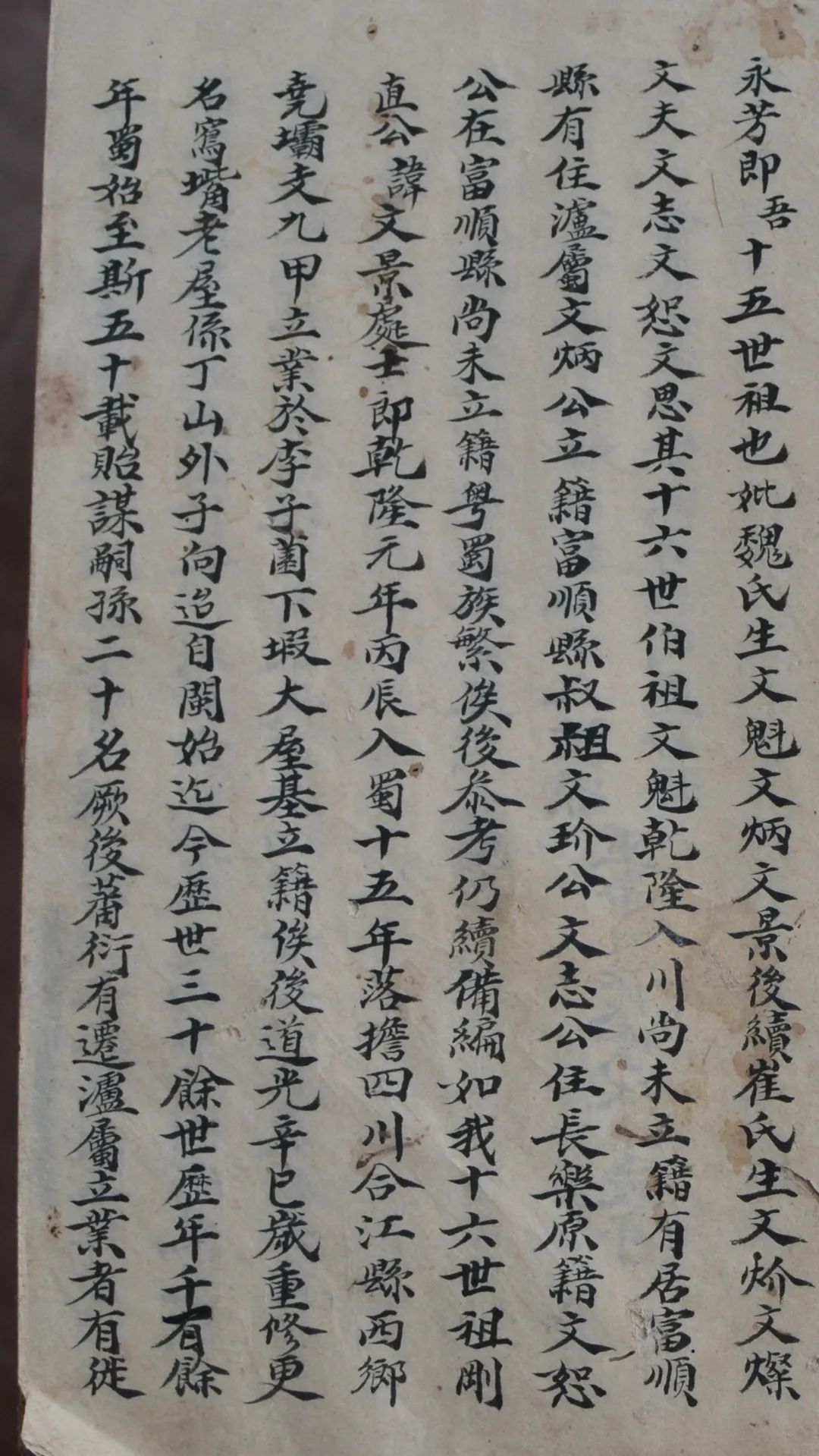 入蜀始祖文景公之孙巫怀云,清嘉庆五年(1800)撰《巫氏族谱》序曰:永芳之子16世祖文炌、文志仍然住长乐原籍外,其他儿子开始移民入川;文魁于乾隆年间入川,居富顺未立籍;文炳住泸立籍;文恕住富顺未立籍。巫氏迁蜀50载,有贻谋翤孙20名,之后繁衍,有迁泸属立业者,有徙本邑及贵州、甘肃者,有移纳溪、永宁经商者。