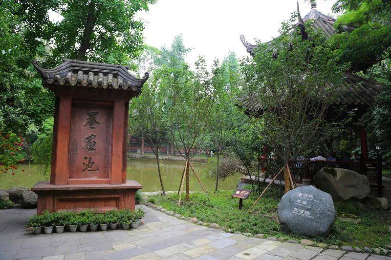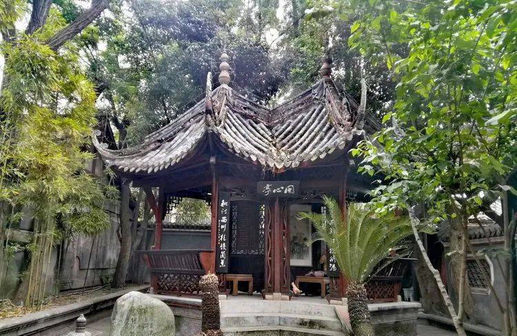 同心亭,位于罨画池博物馆陆游祠侧院内。这座亭子的造型是由两座亭子相互交加而成,恰似连体并肩、紧紧偎依、亲密无间的两位朋友。这是特意为追慕陆游和张縯的友谊佳话而设计的。