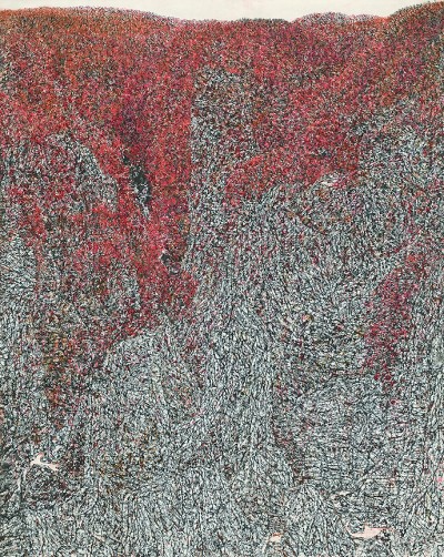 对于留白的处理,画家唐允明同样选择了继承传统,但他的方式和李文信截然不同,他将画面中的留白浓缩到了极致。用唐允明自己的话讲,在创作中他并不着重于对自然中具体景致的描绘,而是注目山水间微妙而和谐的关系,以及丰富、多变的自然形态,以期从其显著的视觉特征中获得美的感受。由他创作、获得第七届全国美展铜奖的作品《野山》便表达了这种自然情境。画面中,盘曲且充满生命力的线条,满密的画面以及纷繁的笔痕,构成异乎寻常的画面效果。在这令人窒息的满密结构中,空白几乎被压缩到了极限,而正是这种反差,极大地增加了画面的视觉张力,恰如其分地演绎了作品里“野性”的一面,这种“野性”的气象也折射出画家骨子里的那份傲气。《野山》中传达出的审美取向也正是唐允明心中的山水意境。唐允明在第八届全国美展中获奖的作品《红岭》延续了极致压缩留白的审美特征,同时弱化了对画面层次感的塑造和对真实物象的描绘,取而代之的是平面性的造型和模糊化的物象。这种密不透风与留白产生的强烈对比和平面化的构成,使唐允明的山水画作品有着非常高的辨识度。