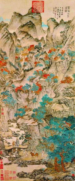 以王蒙为代表的画家,在经营画面时通常采用以“密处取气”为主的满密构图方式。其代表作《葛稚川移居图》,取全景式的竖构图,强调万壑绵延、众山环抱所形成的满密氛围。除画面顶部的天空和左下角的水面以外,其他地方遍布山石树木,显得格外郁然深秀。画中留白的部分被压缩,反而弥显珍贵。画面中峰回路转、林木丰茂,加上飞瀑流泉、曲径通幽,营造出一个环境幽深、远离尘嚣的场景,流露出画家对“采菊东篱下”的归隐生活的渴望,隐现出其内心世界里留存的那一方净土。