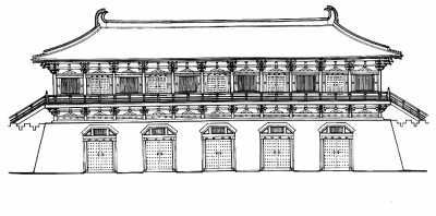 目前考古发现宫城正门“一门三道”最早的是北魏洛阳城宫门——“阊阖门”遗址,此规制一直延续至明清北京城故宫午门。
