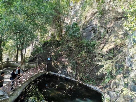 今虽不见“绿竹”,但“滴水岩”仍在,据其地形地貌仍可想见古人咏赞的“断岸千尺,飞流直下,如练如簾,如雾如烟”之美景。紧挨“滴水岩”上方,修建有“荡胸湖”。因修湖之故,“滴水岩”石壁已做护坡加固处理,但看上去仍然常年流水浸润,坡度接近垂直,高近30余米。据此可判断,此地曾经水源丰盈,若非人力蓄水,当有飞瀑直下。