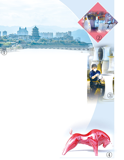 图①:江西景德镇远眺。 图②:景德镇瓷器。 图③:工人师傅制作瓷器。 图④:生肖瓷作品《拓荒牛》。资料图片