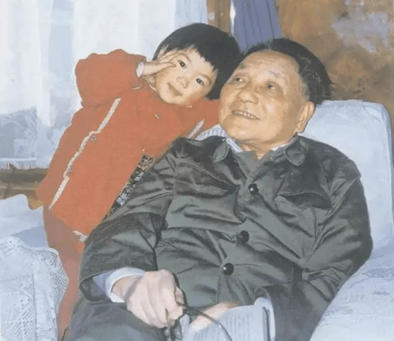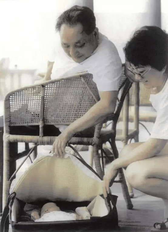 邓小平慈爱地凝望着襁褓中的小孙孙,右为其女儿邓榕