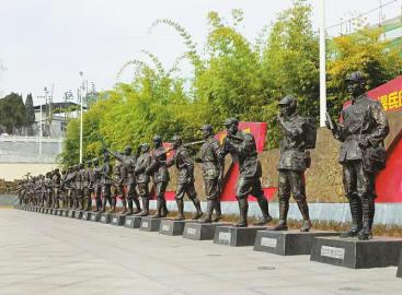 在乐山竹园烈士纪念园英雄广场,两侧各立有35座解放军战士的全身雕像,每座雕像的底座上逐一刻着烈士的名字、籍贯以及牺牲时间。