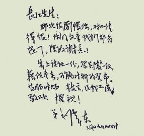 “长江先生:那次很简慢你,对不住得很!你的文章我们都看过了,深致谢意!寄上谈话一份,祭黄陵文一纸,藉供参考,可能时祈为发布。甚盼时赐教言,匡我不逮。敬颂撰祺!弟 毛泽东”。