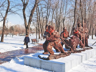 辽宁丹东鸭绿江畔,志愿军公园雕塑《支援》。光明日报记者 刘勇摄/光明图片