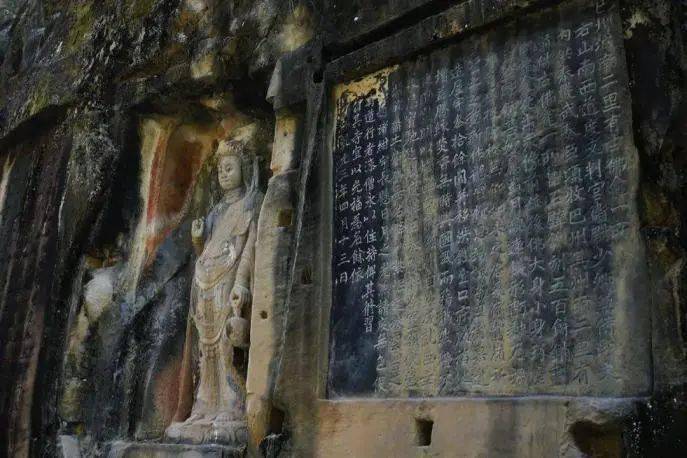 起初,能于此开龛造像的大都是达官显贵,他们有权有财,自能开凿精美的佛像,或用以祈福,或以之表明自己的信仰虔诚。例如杜甫的好友巴州刺史严武便在南龛建树颇多,他不仅在南龛重建寺庙屋宇、雕造观音像,更奏表皇帝为其求得了“光福寺”之名。直到今天,严武“奏表”碑仍是清晰可辨,惹人注目。再如张祎,这位跟随唐僖宗入蜀的高官大臣,他不但在南龛造像,还在题记中详述了他“追扈大驾”西巡的行程以及修造佛像的经过,有着极大的历史价值。