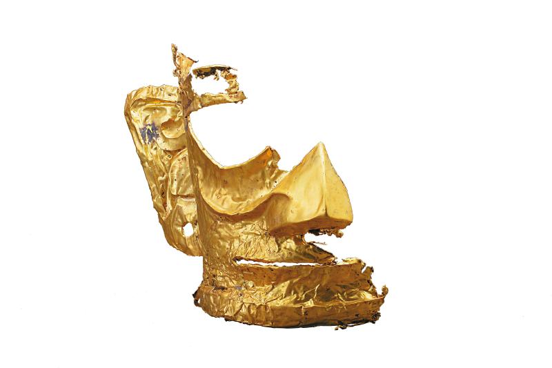 大家开始兴奋起来。到今年1月上旬,这块金箔已完全揭露出来。由于被折叠和挤压,在普通人看来,这就是一块皱巴巴的金箔,但是拥有丰富经验的省文物考古研究院专家看到后立即大胆猜测推断——这不是普通的金箔,而是一件黄金面具!