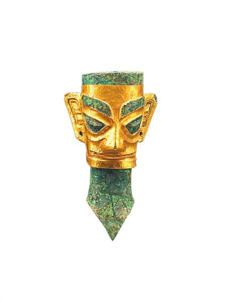这些制作精良的金器,也反映出古蜀人金器制作工艺的高超和独特。例如,此前三星堆遗址出土的覆盖在青铜人头像上的金面罩,在部分金器残片背部黏附着铜锈,说明是在青铜重器上再饰黄金,这种金铜结合使用法极为特殊,在其他地方未曾见过。这些出土的金杖、金面罩,其独特的文化形态及造型风格,为古蜀文明增添了许多神秘感。