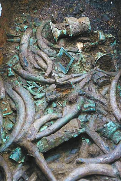 走进发掘现场的3号坑附近,可透过工作舱玻璃,望见长5.8米、宽2.5米左右的长方形祭祀坑位,祭祀坑四周是深褐色的泥土。目前该坑发掘深度为1.8米,预计深度约2米。在坑内约15平方米的空间里,集中发现了100多根象牙和圆口方体铜尊等,由于保护的需要,它们的外表均被湿毛巾覆盖,然后再裹上一层保鲜膜,因此只能看出大致轮廓。