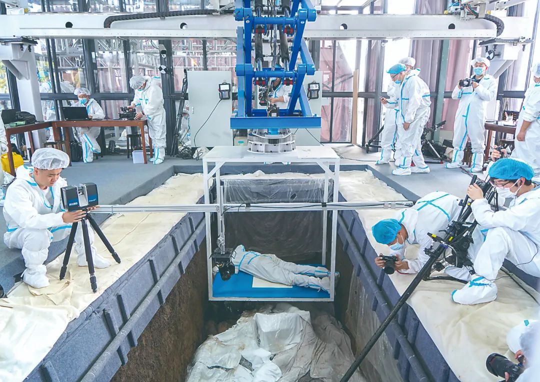 为什么?发掘现场,一个大跨度钢结构大棚里,数个通透的玻璃房子将6个“祭祀坑”罩住。在控温控湿、装满各类设备的“考古舱”里,工作人员身着防护服进行工作。不仅如此,考古实验室也“前移”到考古现场,必要的先进设备一应俱全,实现考古出土文物与文物保护与研究的无缝对接。