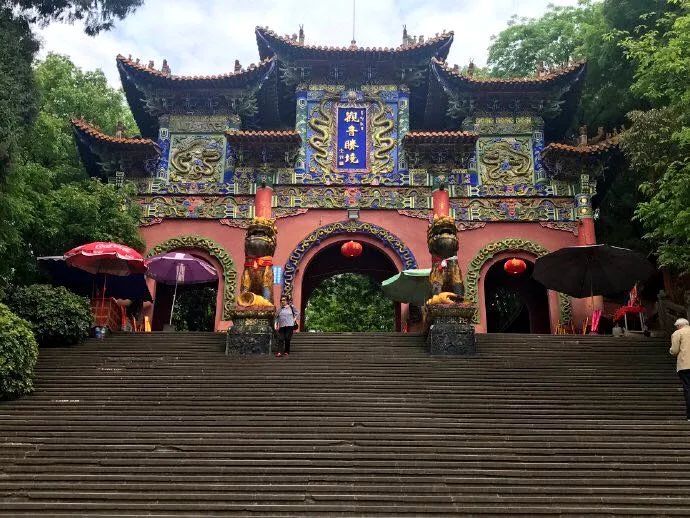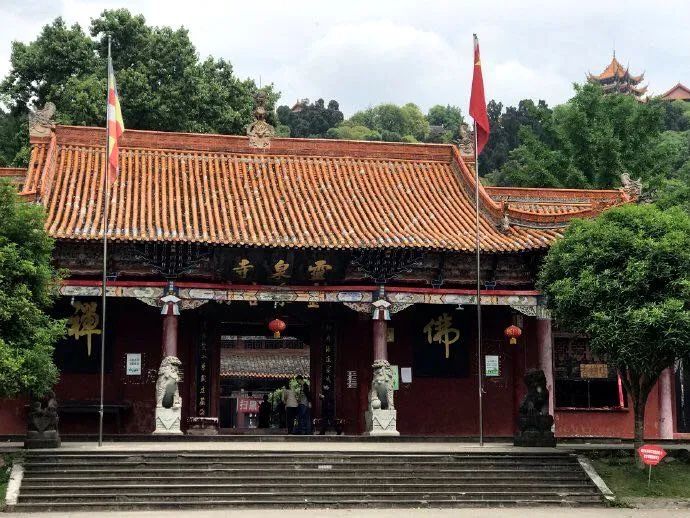 参观了观音殿、祖师殿、眼光殿等9个殿堂后,我们徒步穿过古色古香的长廊,沿着陡峭的山间石板阶梯下到山底,来到灵泉寺下寺。这里建有大雄殿、天王殿、文昌殿、古佛殿等12个殿堂,山门上悬挂着“灵泉寺”3个金光闪闪的大字。