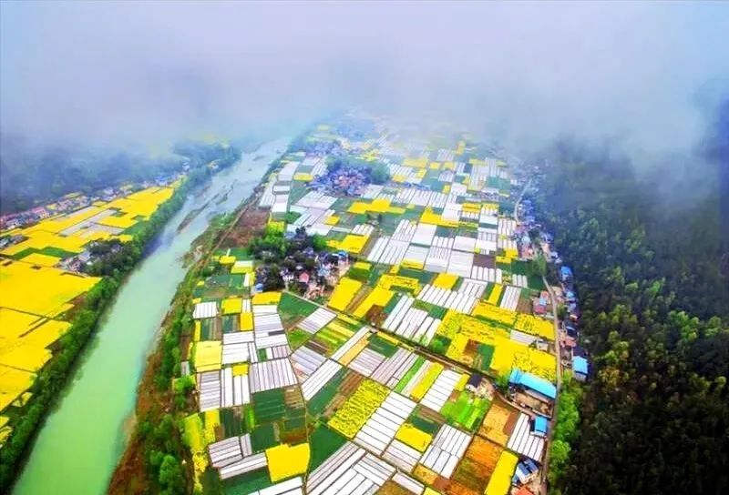 阳光下,满眼苍翠,让水河在青青麦苗和金黄菜花中静静流淌,似乎要把人带回唐朝,聆听李白读书声,和李白一起吟诗舞剑……
