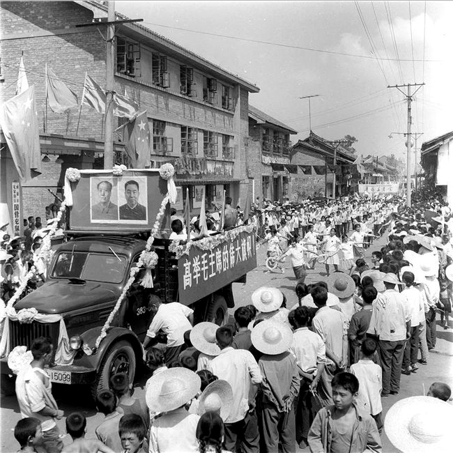 1977年,庆祝中共十一大的游行队伍通过成都龙泉镇中街