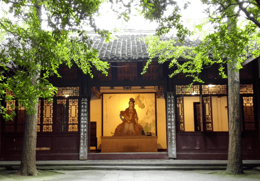 自唐代以后,浣花溪畔一直建有浣花夫人祠,但不同的时代,位置也会有所不同。浣花夫人祠初建时间推测是在五代十国,宋代时是在草堂寺中,清初重建时在草堂寺东侧。光绪十二年,人们将其迁移到了现在的杜甫草堂之内的花径与盆景园之间。