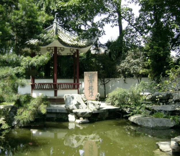 唐宋时期的百花潭与浣花溪更加相近,在当时的文献中可以见到对二者不加区别的记载。今天人们最熟悉的大概杜甫诗中所言的“浣花溪水水西头”(《卜居》),他又说“百花潭北庄”(《怀锦水居止二首》)。当时的百花潭位置应该是在今天的杜甫草堂西南,宋代之后逐渐消失。而今天的百花潭与浣花溪之间已经有了一段距离。