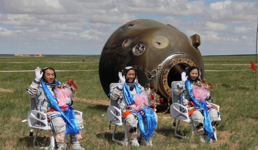 2013年6月26日,历经15天太空飞行、圆满完成任务的三位航天员张晓光、聂海胜、王亚平(从左至右)自主出舱后向人们致意