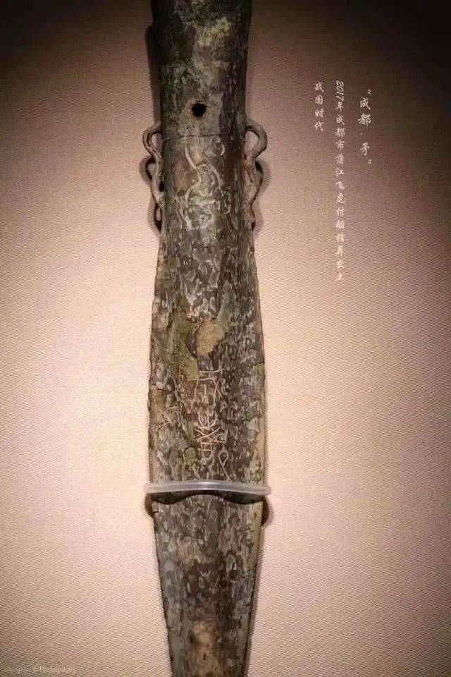 著名的成都矛,2017年在蒲江飞虎村发现。蒲江在出土先秦时期的船棺中发现一枚矛头,上面刻有“成都”二字,距今约有2300年,是成都名字由来的最早证据(向文军 摄,图片来源:蒲江文旅)