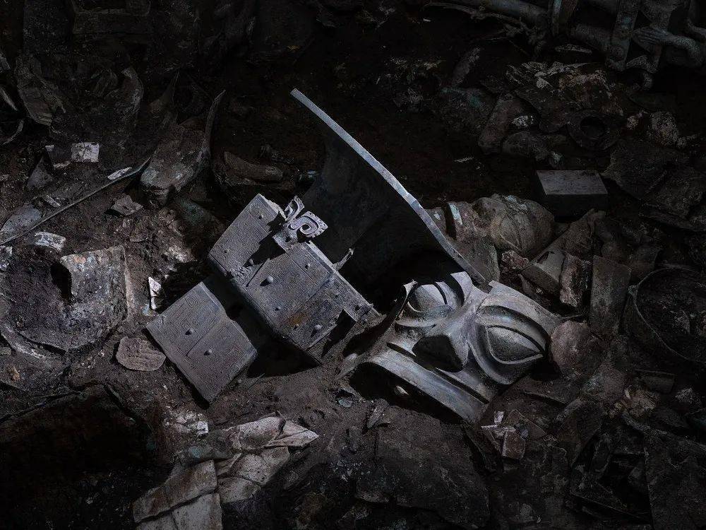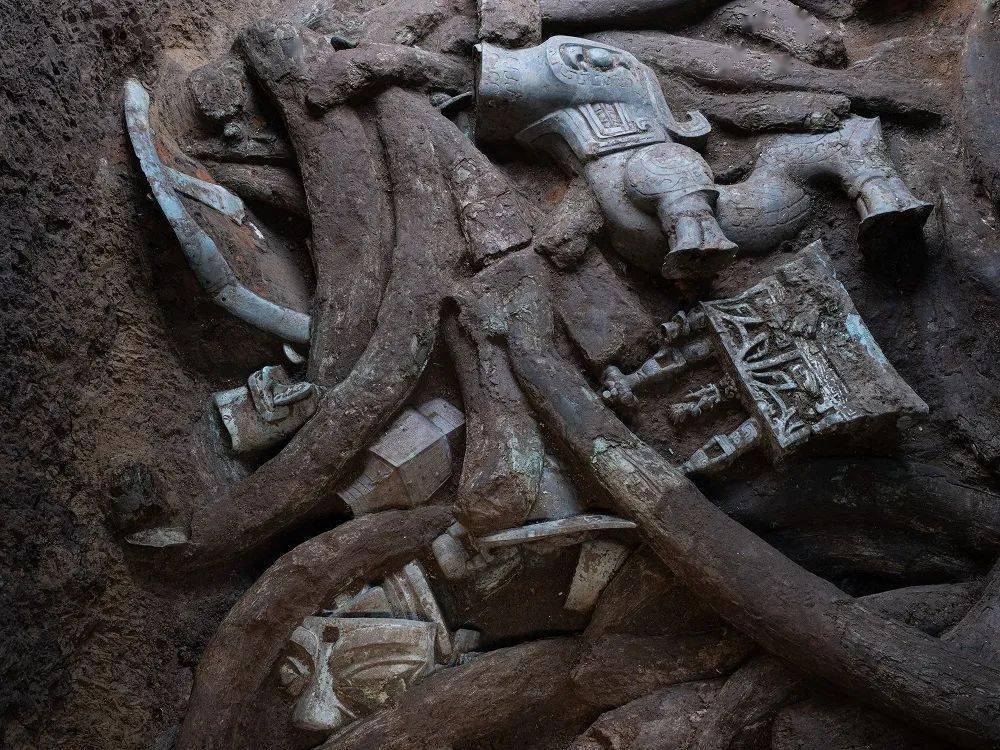 K3位于8座“祭祀坑”所在区域中部,开口面积约14平方米。推测K3埋藏之后不久,这个区域就废弃了。K3出土各类器物残件和标本共729件,较完整遗物共478件(组),残件141件。其中,较完整器物包括铜器293件、玉器45件、象牙100根、金器7件、骨雕2件、石器2件、海贝26件(组)以及材质不明器3件。