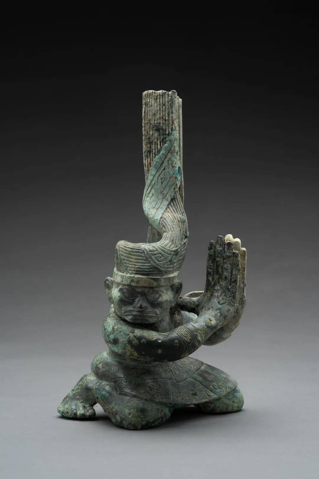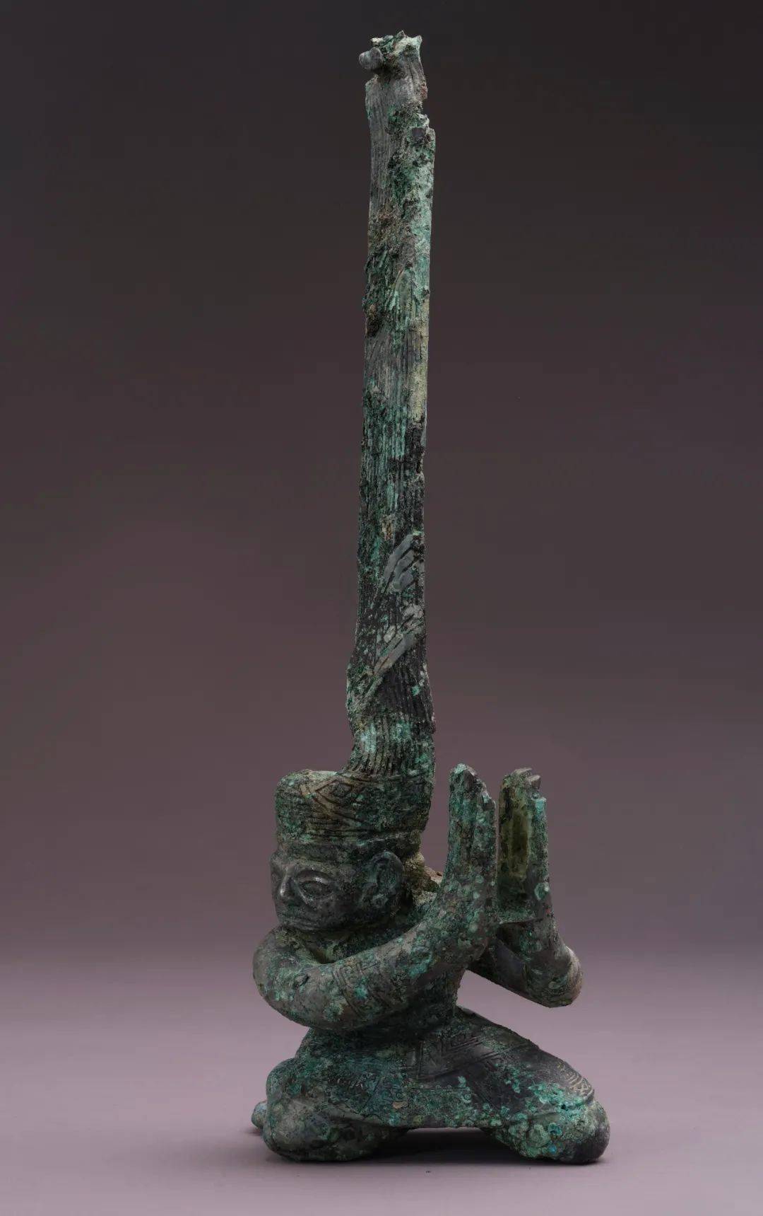 K3出土的铜顶尊跪坐人像,由上半部分铜尊与下半部分人像组合而成。铜祭坛、神树纹玉琮等器物,题材独特、细节丰富,均前所未见,是古蜀人精神世界的物质体现,为进行相关研究提供了重要素材。