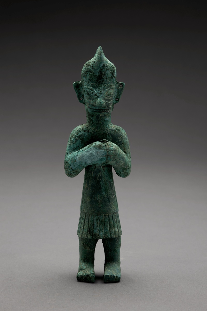 K4出土3件铜扭头跪坐人像,大小、造型一致,似同属一件铜器。人像呈跪坐姿态,身体略向左前方倾斜,头微颔并扭向身体右侧,双手呈半“合十”状平举于身体左前方,两膝贴地,双脚前脚掌着地,后脚掌抬起。人像身体重心在左肩与双手手掌之间卡槽的位置,表现出强烈的负重感。这3件人像从造型、纹饰等方面来说都是三星堆考古全新的发现,对研究三星堆的青铜铸造技术及艺术、宗教信仰与社会体系、与周边地区的文化交流提供了材料。