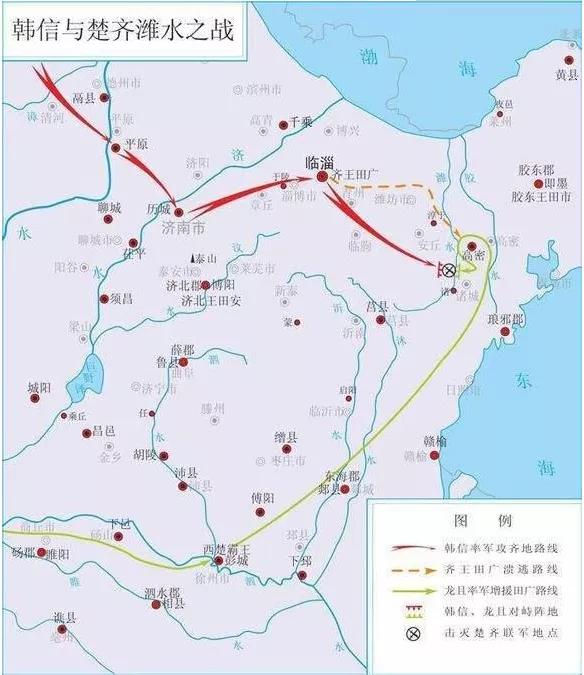 楚汉战争。淮阴侯韩信率军东击齐王田广,以完成对楚军的翼侧迂回,楚王派龙且北上救齐。隔河相拒,韩信在诸城北部的潍河段筑坝遏水,布阵击杀楚将龙且,大败20万楚军。