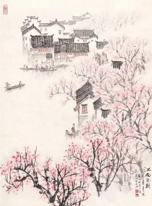 句中自对:“半壕”对“一城”;“春水”对“(春)花”,十分工整。连用“半壕”“一城”与“千家”,从少到多,由近及远,视野逐渐拓宽变大,将烟雨江南图刻画得栩栩如生。