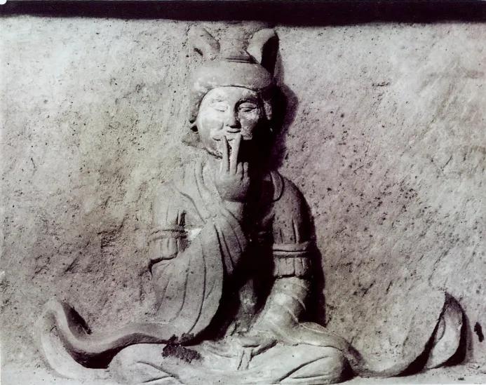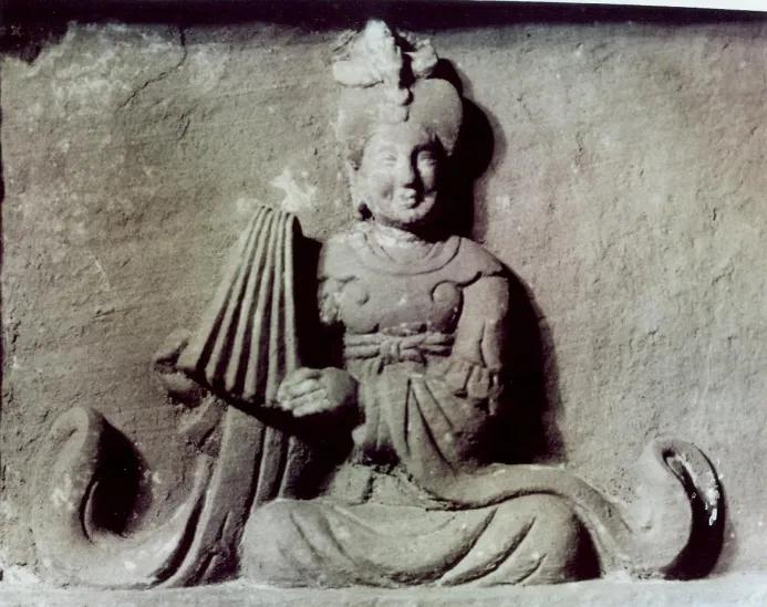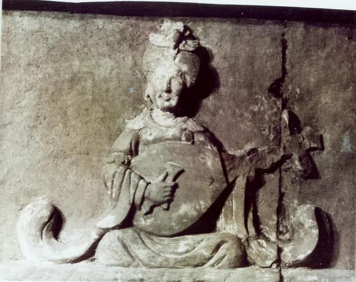 “卷叶吹为玉笛声”,这是唐代诗人白居易描述吹叶的诗句。吹叶流传于我国南方,现在贵州少数民族中还有吹奏的。墓中所雕乐伎,以右手二指按叶于唇间,左手尚拿着两片叶子以备调换,可谓姿态逼真,维妙维肖。
